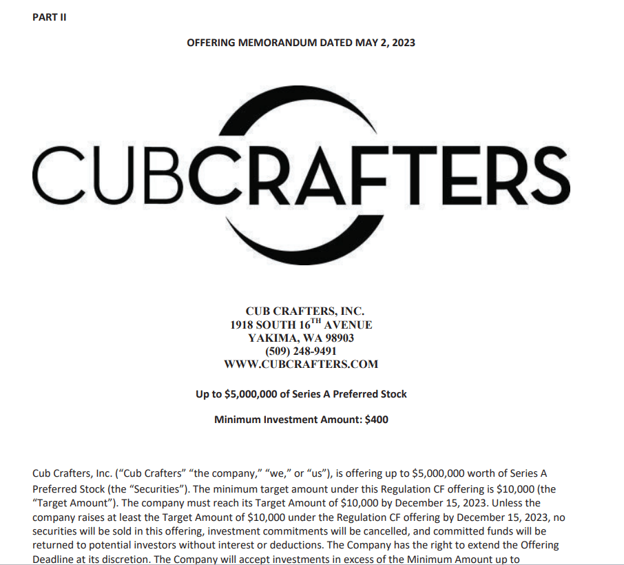 In November 2022, CubCrafters opened a multi-path public offering to everyday investors under Regulation A, CF, and D — the first of its kind in general aviation.
