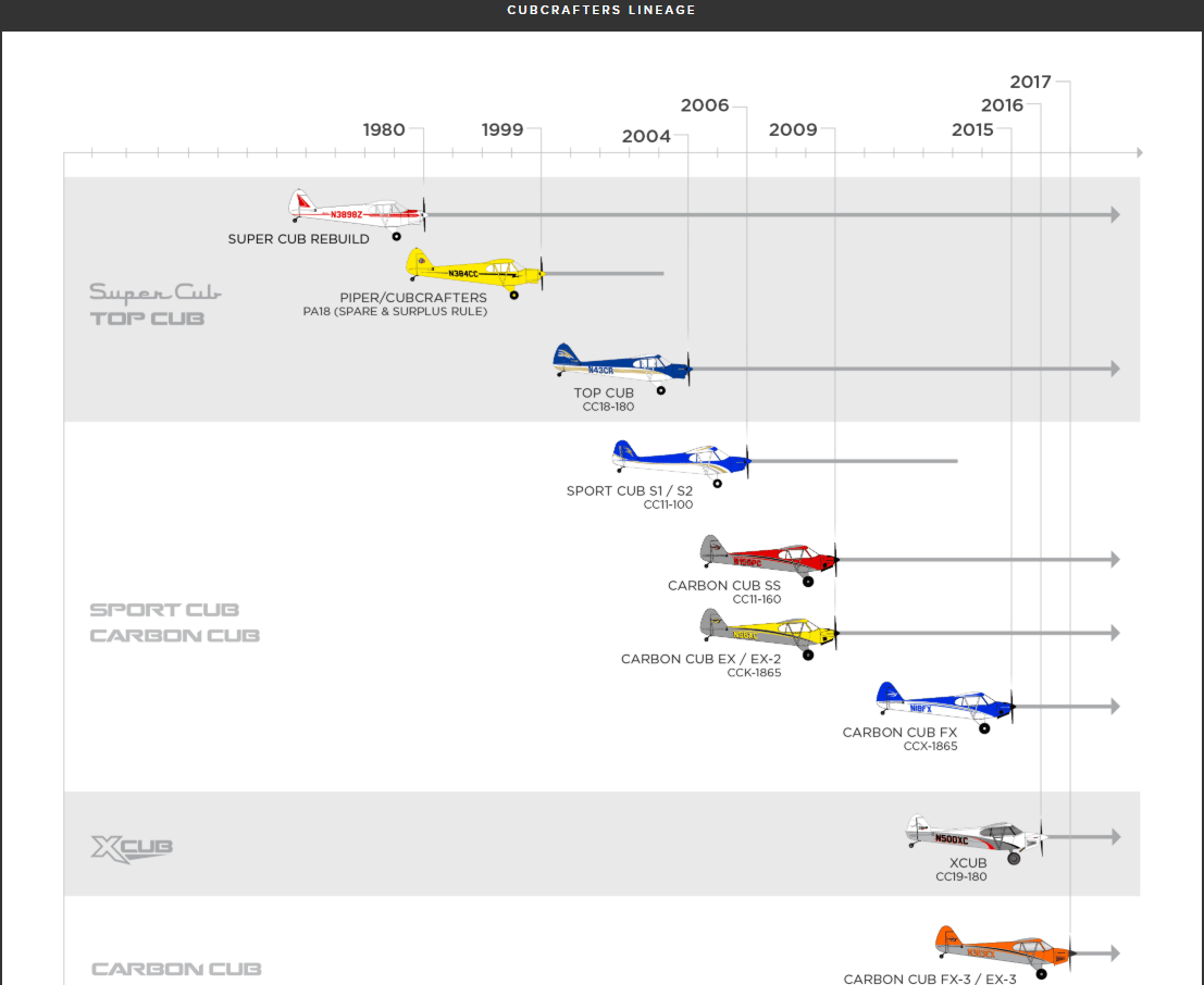 Milestones include the Top Cub certification in 2004, the NXCub nose-wheel configuration approved in 2020, and the forthcoming Carbon Cub UL, a Rotax 916-powered ultralight derivative with first customer deliveries scheduled for Q2 2025.